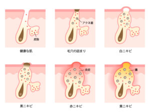 ニキビは、毛穴の詰まりから始まり、炎症の程度によって段階的に症状が変化していきます。初期の軽い状態から、炎症が進んだ重い状態までさまざまで、それぞれに適したケアや治療が必要です。