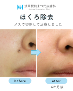 大きいホクロや深さのあるもの、再発リスクをしっかり抑えたい場合に選択されます。ホクロの組織を完全に取り除くことができるため、再発の可能性が低いのが大きなメリットです。最終的には白い線状の傷跡になることが多いです。